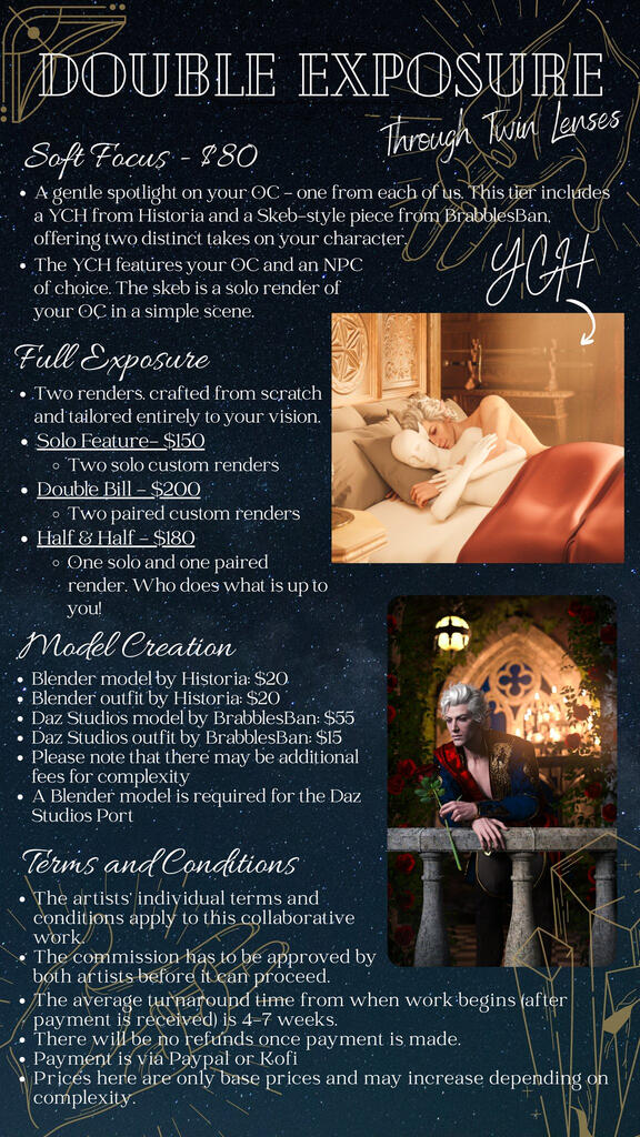 Double Exposure commissions are a collaborative commission experience! These commissions are a little more flexible with regards to time as I aim to match my delivery with my collab partner's.
